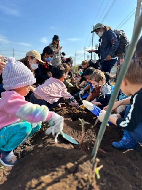 畑で元気にお芋を掘った後は、公園で焼き芋ピクニックをして、みんなでおいしくいただきます。 |