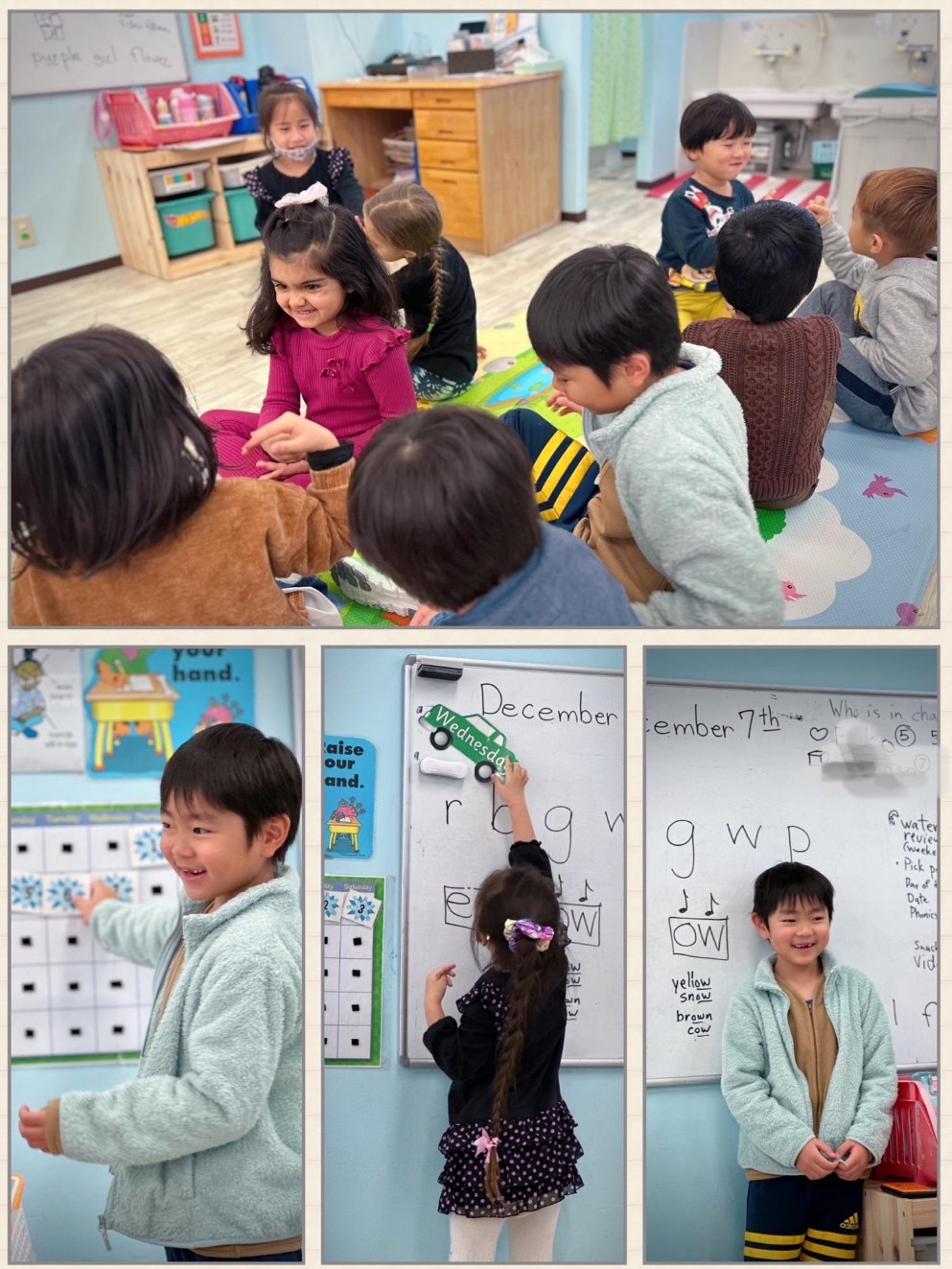 1日の始まりに、挨拶や曜日、天気などのお話をしたり、みんなで歌を唄ったりします。